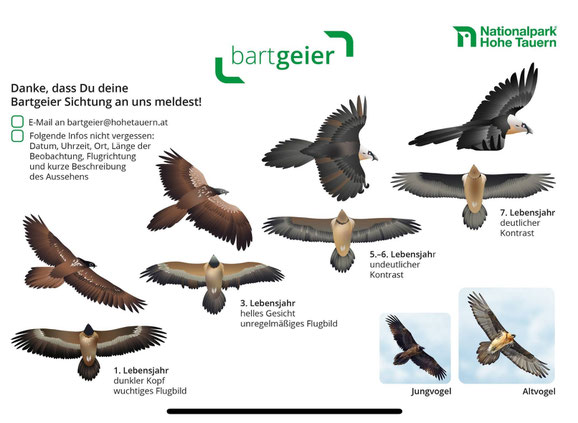 Immer wieder können Bartgeier in den nördlichen Revierteilen unseres Jagdgebietes beobachtet werden. Am Samstag, 11.10.2025 findet zwischen 09:00 Uhr und 15:00 Uhr der Hauptbeobachtungstag statt. Sichtungen sollen per E-Mail an: bartgeier@hohetauern.at gemeldet werden.